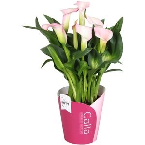 Geselecteerd artikel Zantedeschia French Kiss SoHappyCalla roze met roze potcover Artikelcode P06FK