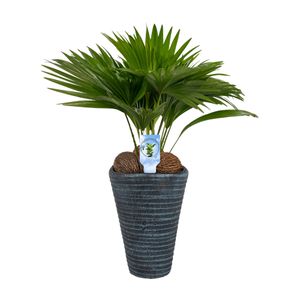 De Livistona is een elegante palm met waaiervormige bladeren die direct rust en klasse brengt. Naast zijn tropische uitstraling helpt hij de lucht te zuiveren door schadelijke stoffen te filteren en de luchtvochtigheid te verbeteren. Mooi én gezond.